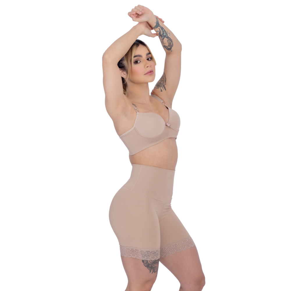 Bermuda modeladora com cintura de cós duplo e perna 1/2 coxa, confeccionada em tecido Confort de alta compressão, oferecendo modelagem eficiente e conforto durante o uso.