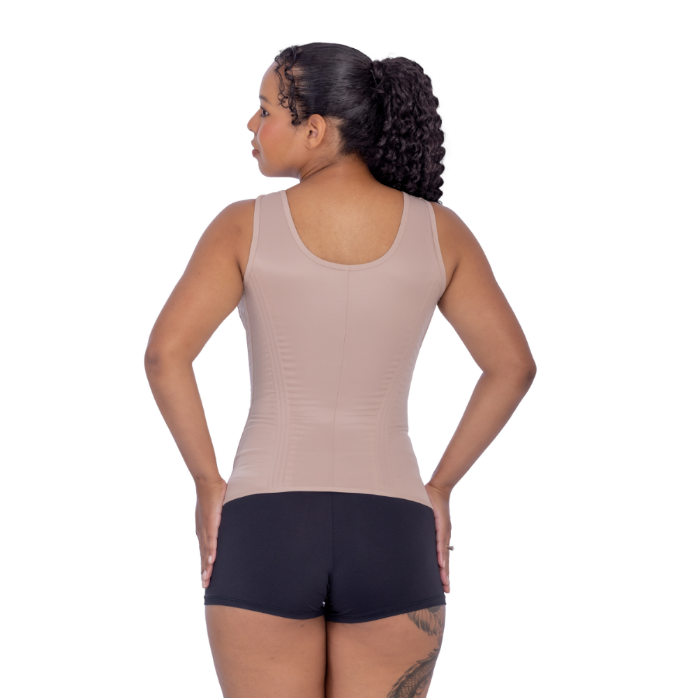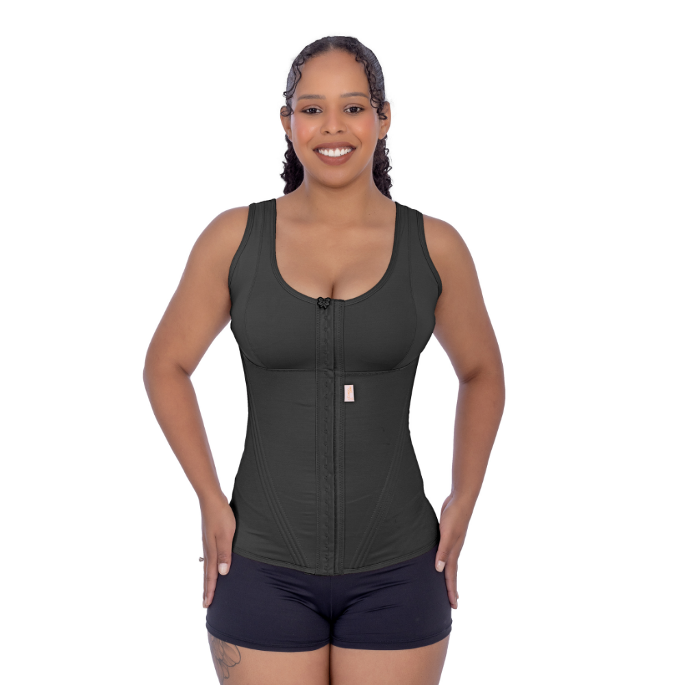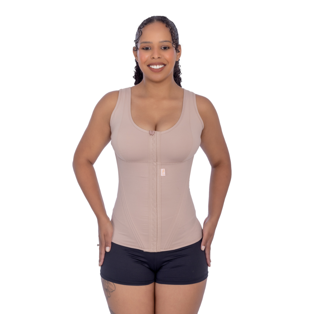 Corpete com alça larga, 12 barbatanas e fechamento em colchetes. Desenvolvido para compressão estética segura e confortável.