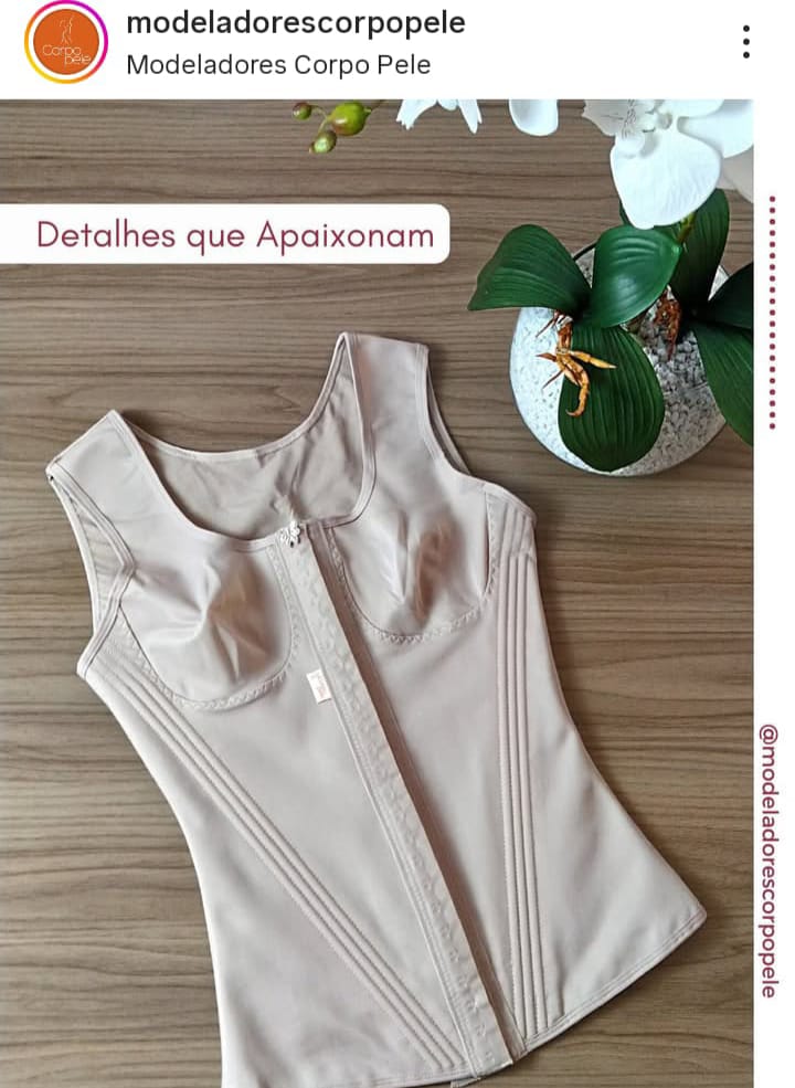 Corpete com alça larga, 12 barbatanas e fechamento em colchete, oferecendo alta compressão e modelagem da silhueta.