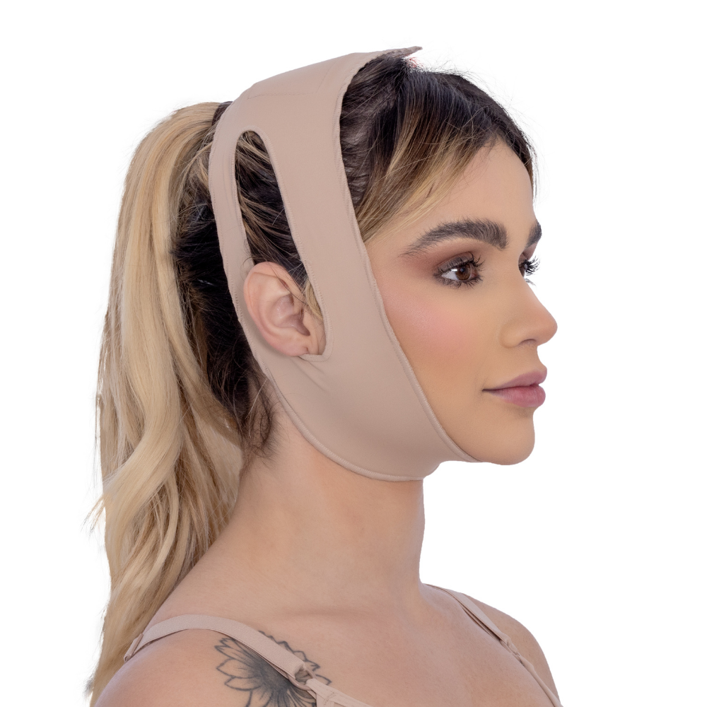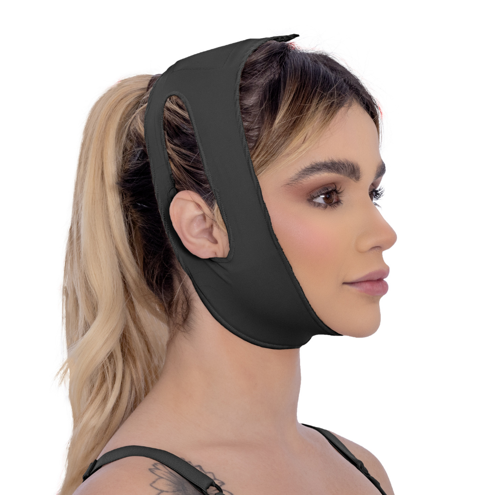 Faixa mentoniana confeccionada em tecido Confort, oferecendo compressão adequada na região do queixo e pescoço para pós-cirúrgicos faciais.