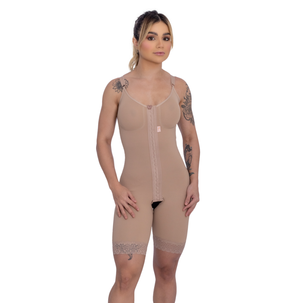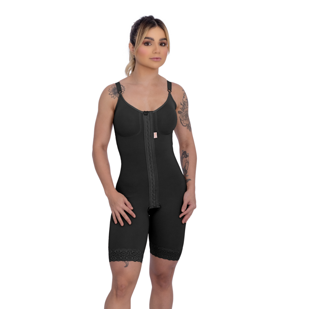 Modelador com busto integrado, pernas 1/2 coxa, abertura frontal e alças finas ajustáveis, confeccionado em tecido Confort de alta compressão para oferecer suporte, conforto e segurança durante o uso.