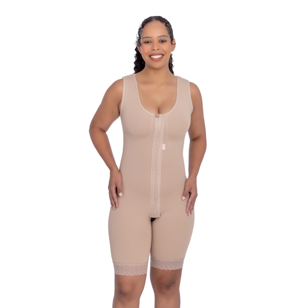 Modelador com busto, pernas 1/2 coxa, abertura frontal e alça regata, com fechamento frontal em colchetes 3x2, confeccionado em tecido Confort de alta compressão, proporcionando modelagem, sustentação e conforto.