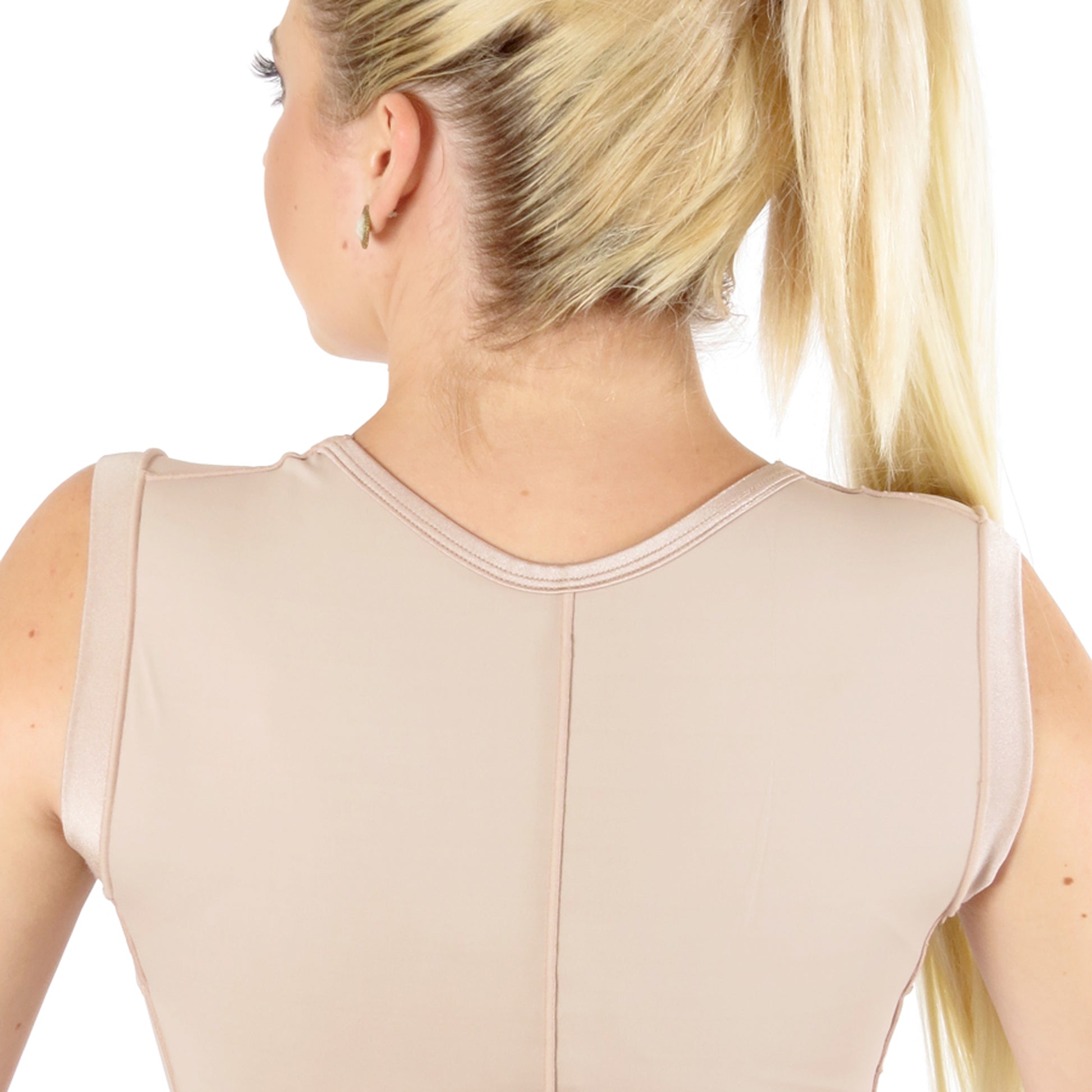 Modelador com busto, pernas abaixo do joelho, abertura frontal e alça larga, confeccionado em tecido Confort de alta compressão, proporcionando modelagem, sustentação e conforto.