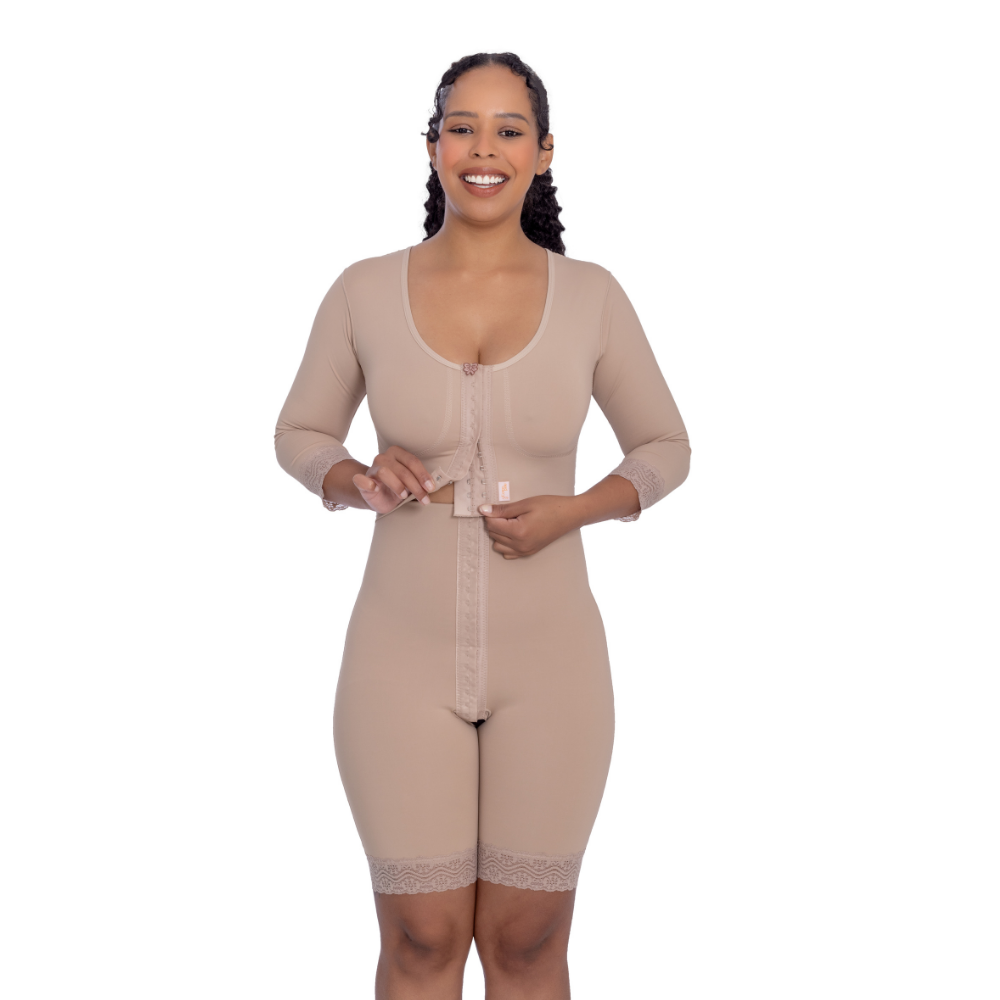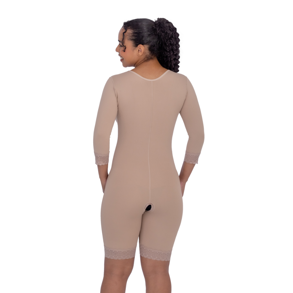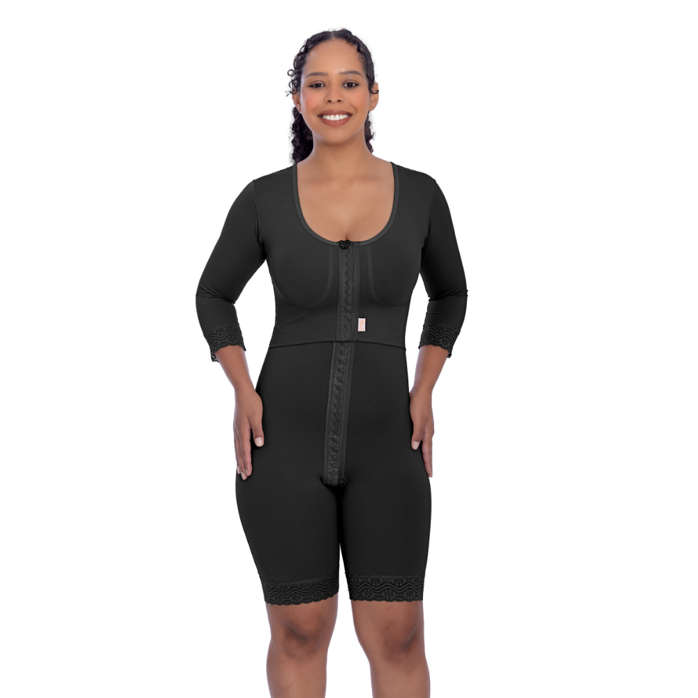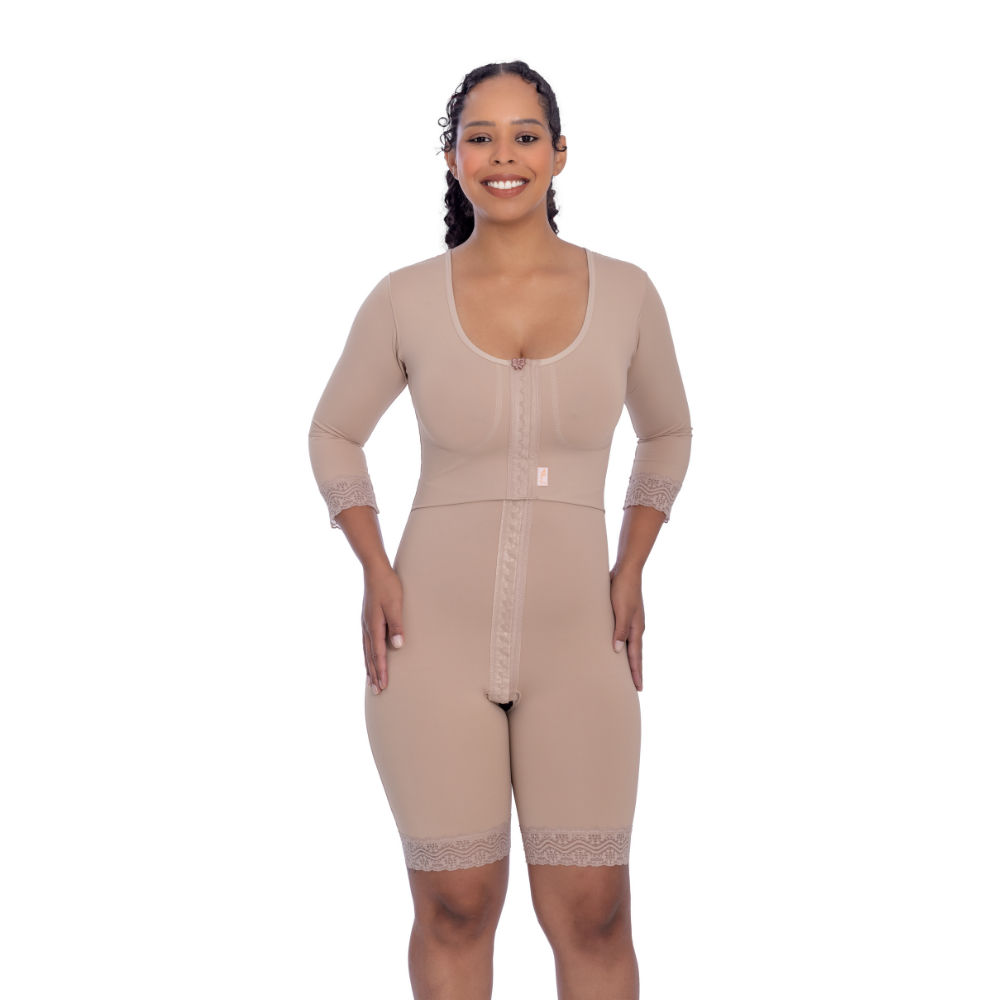 Modelador com mangas e perna 1/2 coxa, abertura frontal