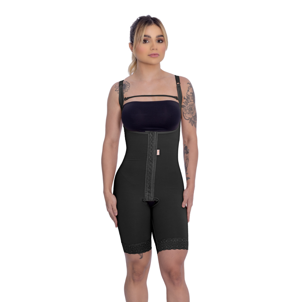Modelador sem busto integrado, com pernas, fecho em colchetes duas regulagens e com alças finas ajustáveis, confeccionado em tecido Confort de alta compressão para garantir sustentação, conforto e segurança durante o uso diário e no pós-operatório.