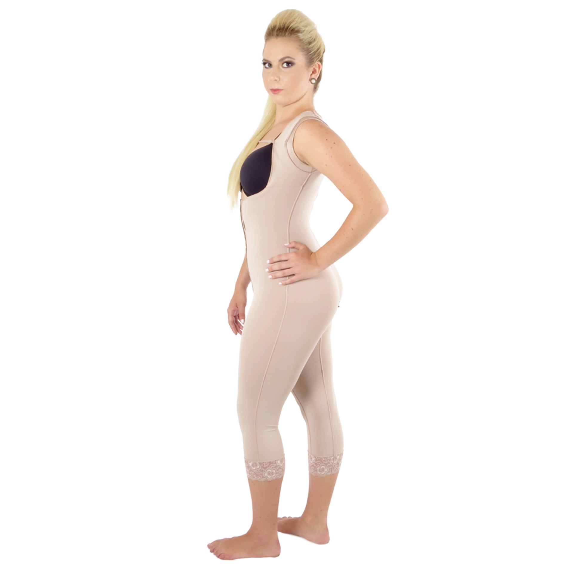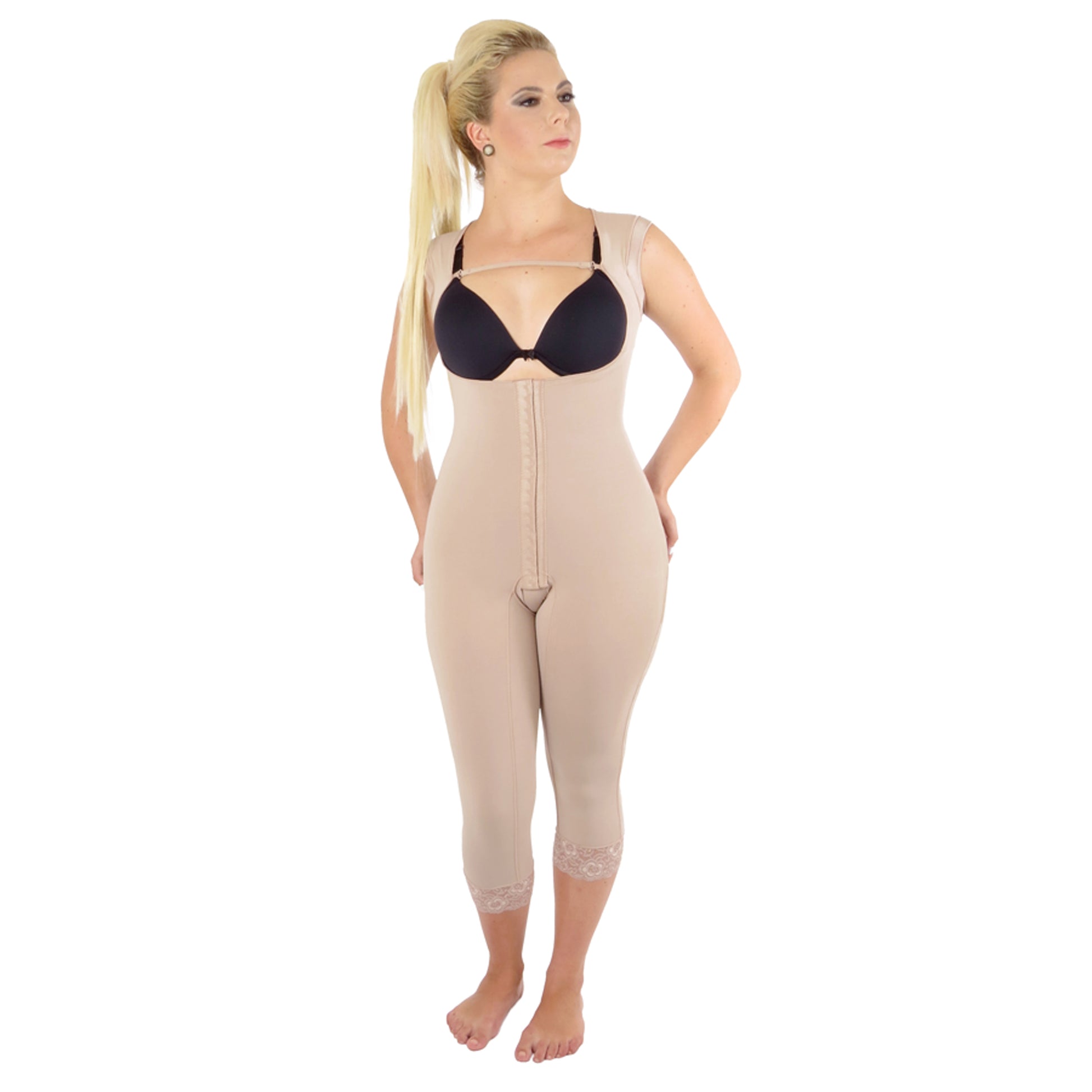 Modelador sem busto, pernas abaixo do joelho, abertura frontal e alça larga, confeccionado em tecido Confort de alta compressão, proporcionando modelagem, sustentação e conforto.