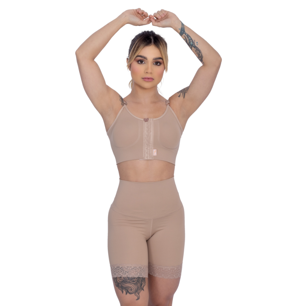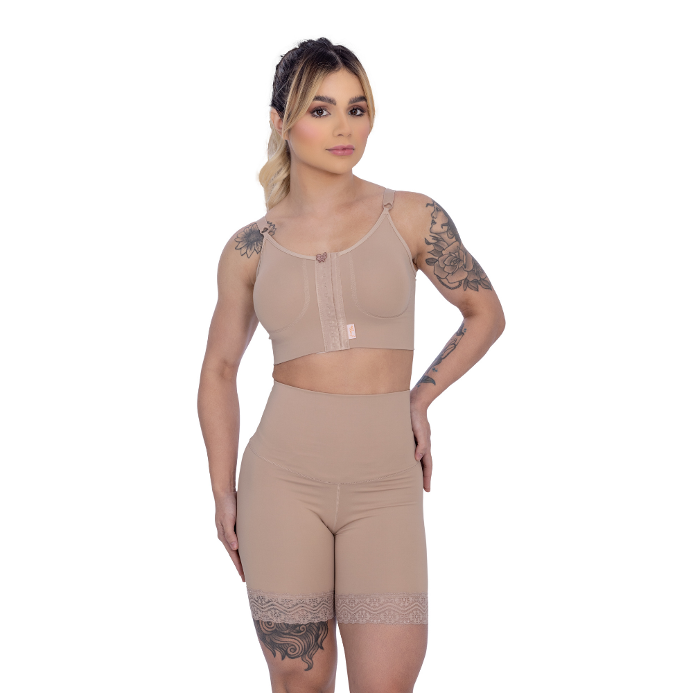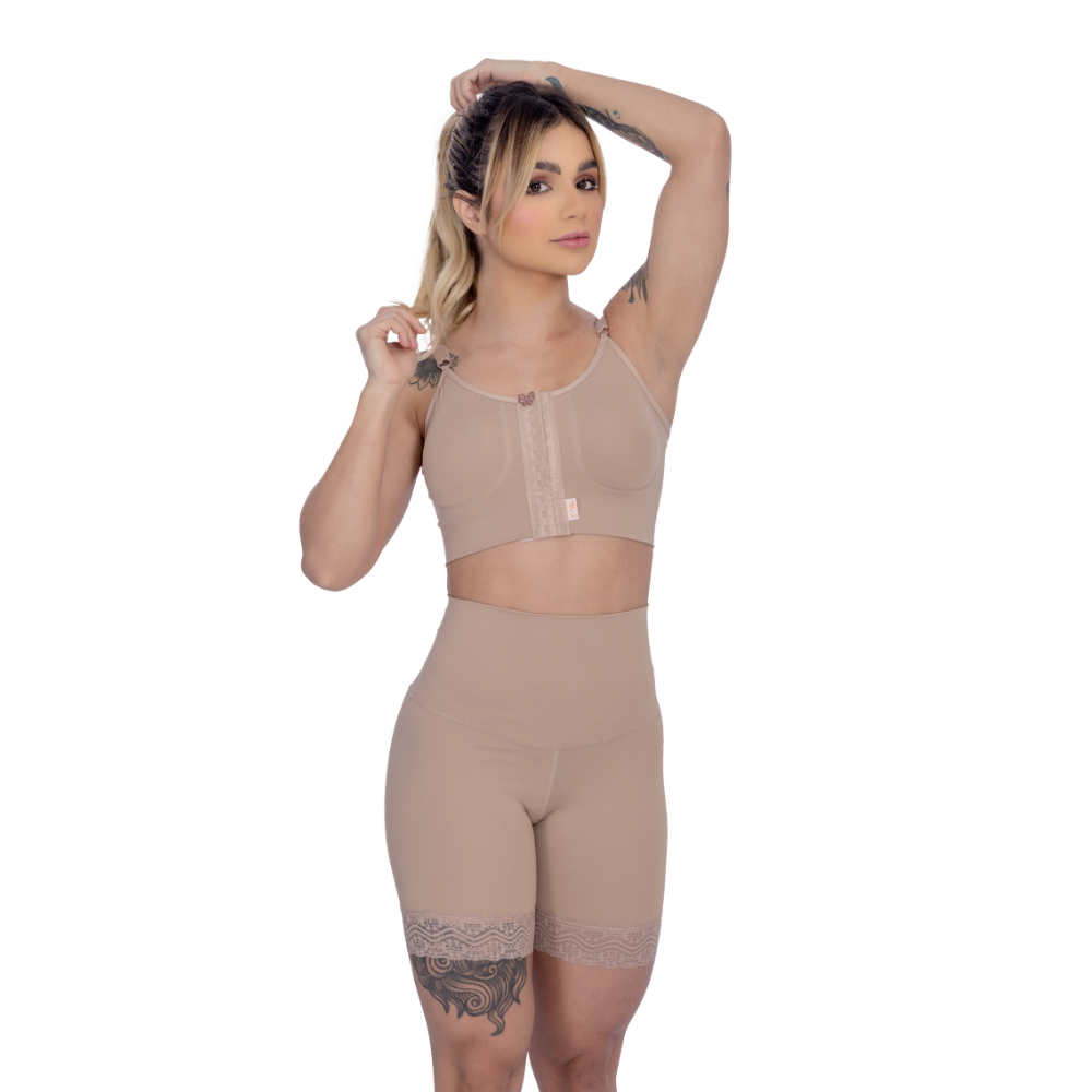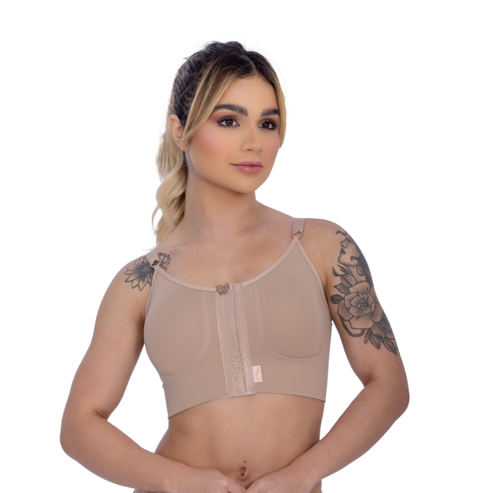 Sutiã cirúrgico com alça fina, colchete frontal e costura no busto, confeccionado em tecido Confort para oferecer segurança e conforto no pós-operatório.