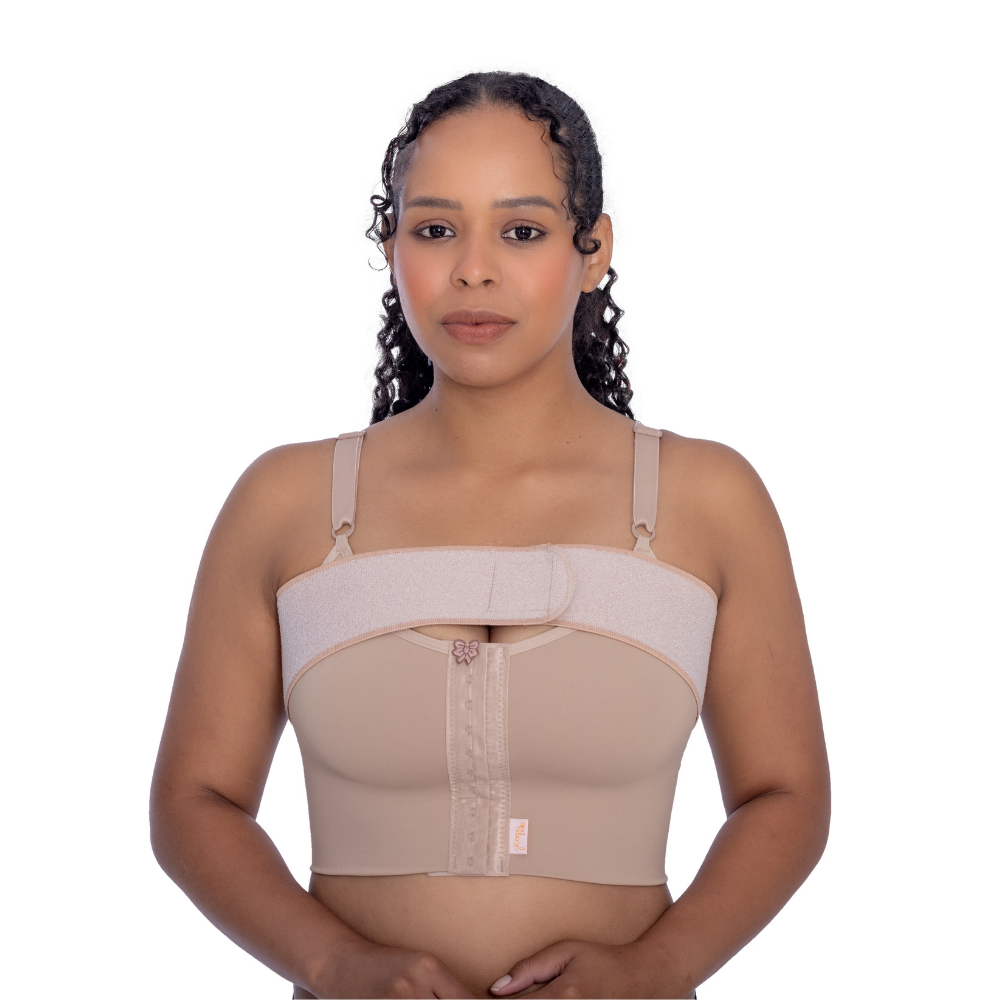 Sutiã cirúrgico com colchetes frontais e faixa de mama embutida, oferecendo firmeza, compressão e sustentação adequadas durante o pós-cirúrgico.